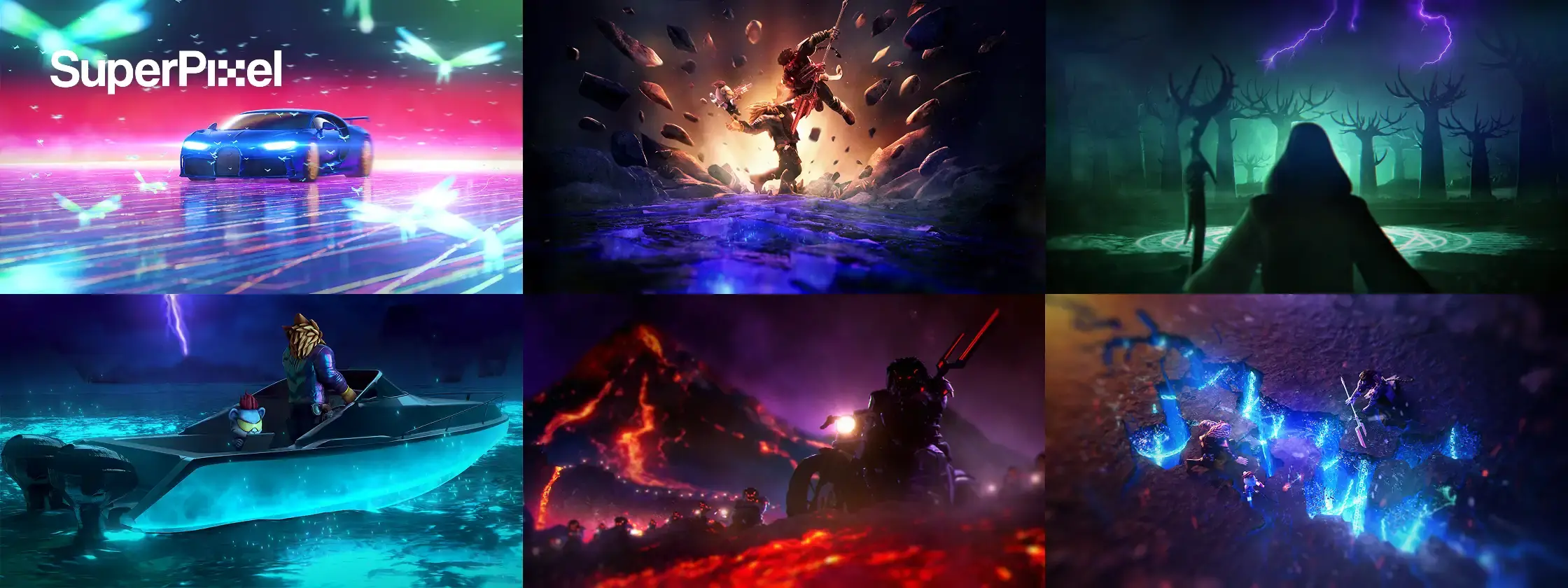 Working from concept art, animatic, and storyboards, SuperPixel brought that vision to life in a 60-second film filled with stylised action, world-building visuals, FX simulations, and seamless transitions.