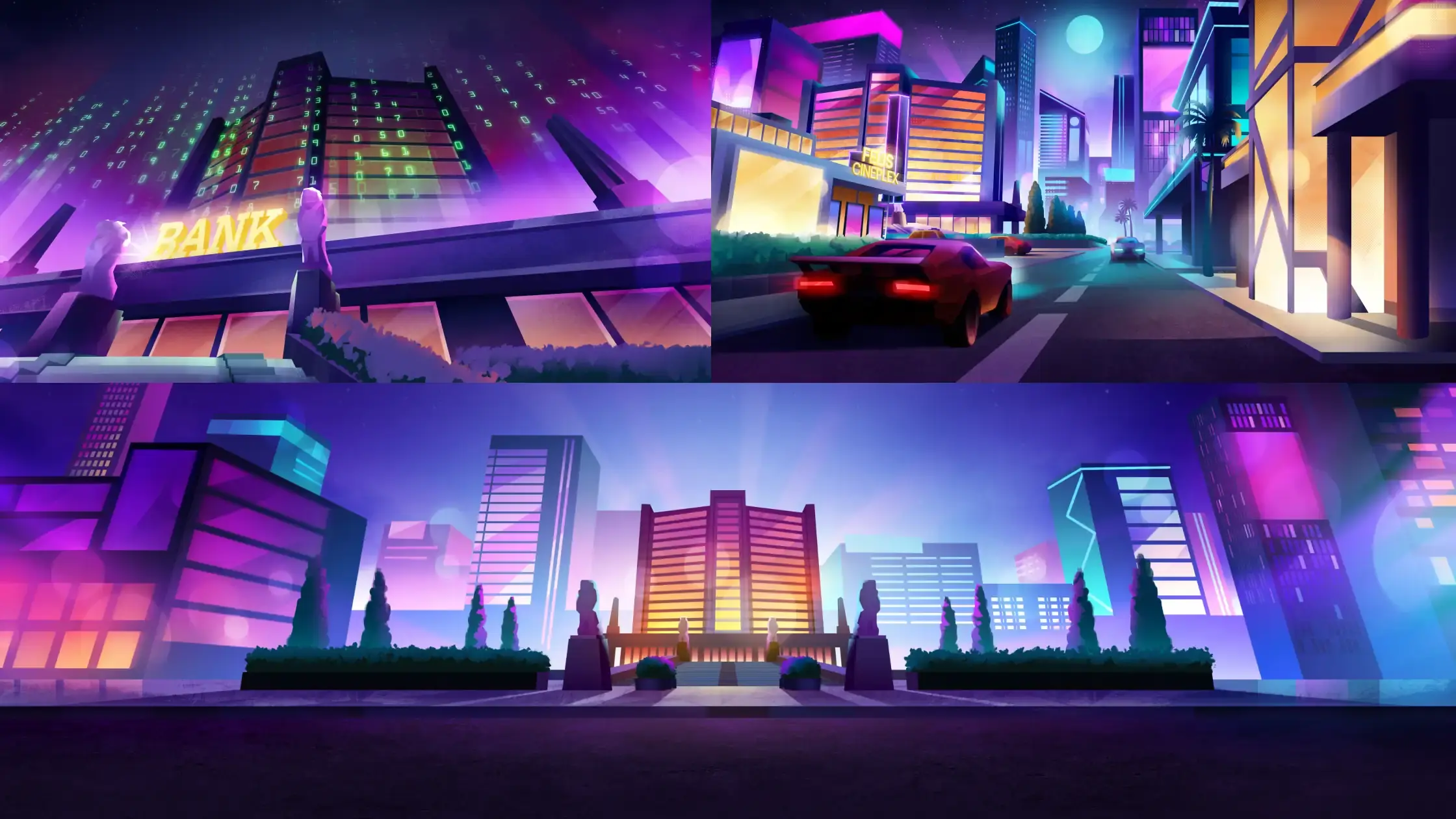 A neon cyber city feels different from a calm tropical beach.